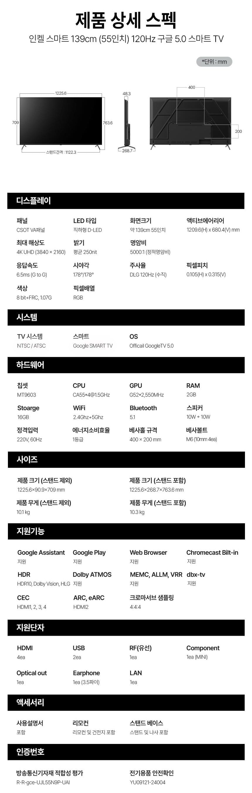 [인켈] DLG120Hz 구글 5.0 스마트 TV 55인치+삼탠바이미 거치대