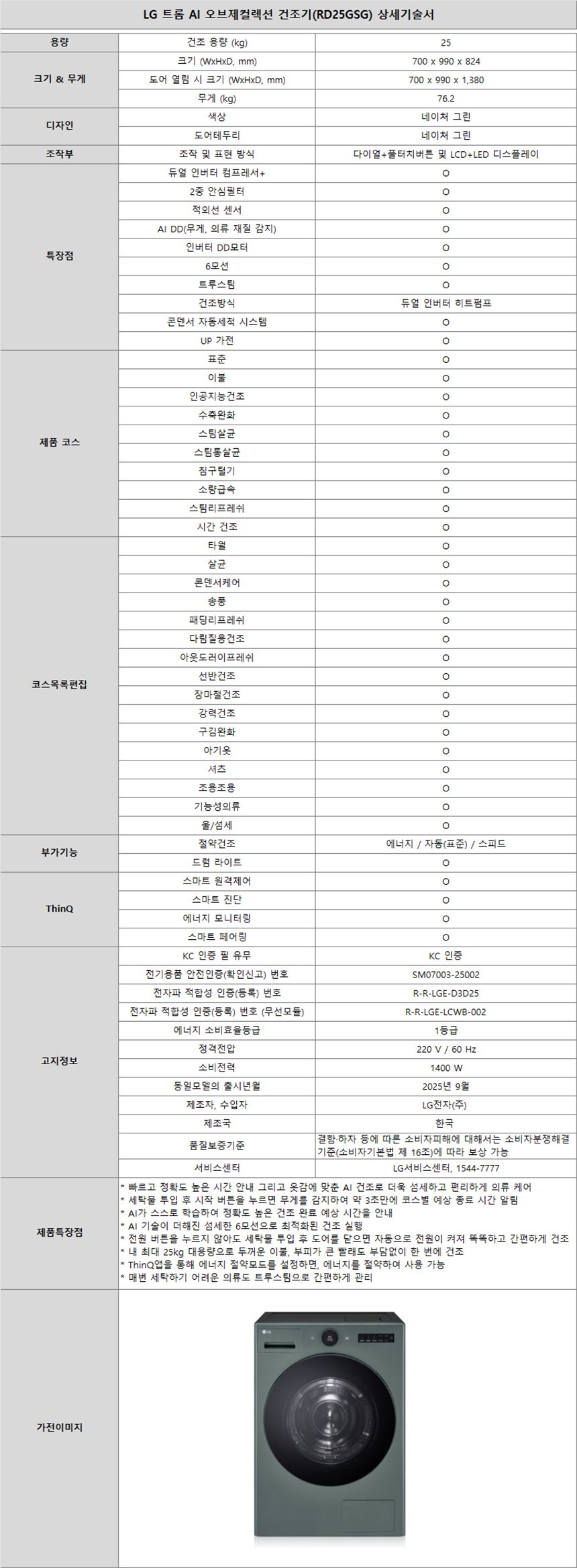 [LG] 트롬 AI 오브제컬렉션 건조기 25kg (네이처 그린)